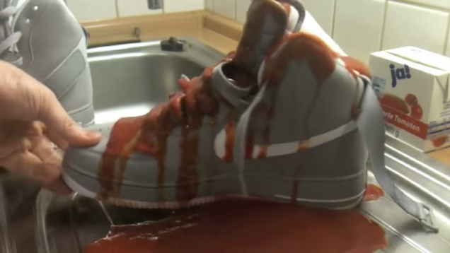 For these fetishists, it’s definitely about sex: many of the videos involve filling the sneakers with squishy pudding, tomato sauce, etc. and getting off to the “wet and messy” (yet another fetish) sensation and erotic sounds. But it’s also about getting off to destroying a perfectly desirable pair of sneakers that many people wait in line and save up for months to buy. To the obsessive fans who worship the shoes, they’re objects of desire, so it makes sense that the fetishists get off by dominating, humiliating, and forcing them into objects of submission—very BDSM. Basically, for the sneaker-destroying fetishists, it’s all about the sexual gratification of worshiping, then thrashing and torturing.