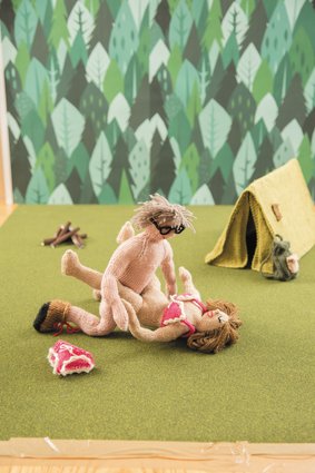 These knitted recreations of hot sex are detailed and, well, sorta hot (see link above). In Erotic V, a fiery red-head gets fucked on top of an office copy machine with her legs in the air. In fact, public sex seems to be a theme: fucking in the great outdoors, in a barn, in a public park. But the best (and most amazing!) are the trickiest positions: in Suspended Scissors, a woman props herself up with one arm as her gentleman friend suspends her in mid-air by her waist and fucks her between the legs.