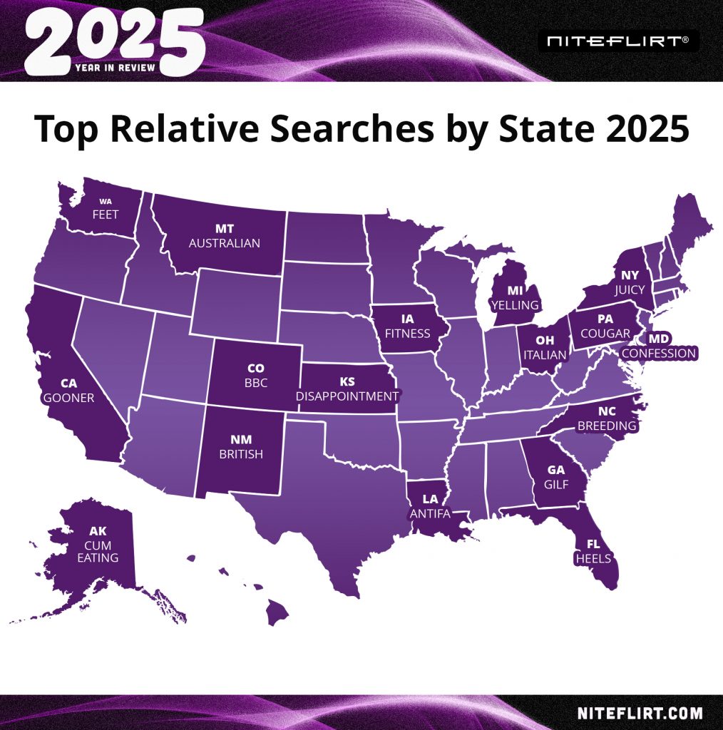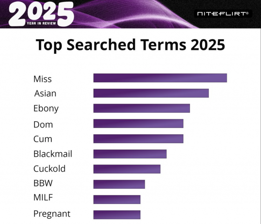For the second year in a row, “Miss” held the top spot as the most searched term on NiteFlirt. Its staying power reflects a continued pull toward dynamics that feel structured, distinctive, and relational.