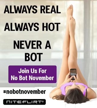 Discover the Difference: Experience what NiteFlirt does best—our Flirts bring their unique personalities to every exchange. Feel the thrill that only a true relationship can inspire. In a world saturated with bots and algorithms, #NoBotNovember serves as a powerful reminder of what really matters: real people, real conversations, and real connections. Join us as we celebrate what makes NiteFlirt one of a kind—authenticity, individuality, and the enchantment of unscripted moments. This November, let’s savor the conversations that make your heart race, your cheeks blush, and actually satisfy those intimate fantasies. Let’s connect and… Speak to Your Desire.