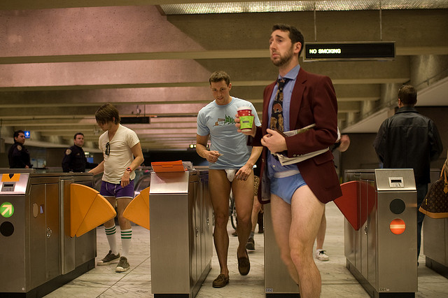 “The participants behave as if they do not know each other, and they all wear winter coats, hats, scarves, and gloves,” explained Improv Everywhere on their website. “The only unusual thing is their lack of pants.” The riders in their underwear ranged from the cheeky (some women with “check it twice” on their asses) to the ironic (one guy with tuxedo briefs complete with tux jacket and bow tie) to the sexy (ladies wearing lingerie and showing off their booties). But the best part by far were the confused riders who couldn’t understand why so many people seemed to have forgotten their pants that day. Those cute pants-less kids were pretty great, too.