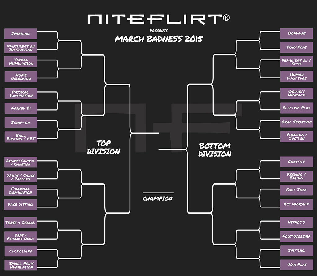 NiteFlirt’s been in business for over twelve years so we know a thing or two about fetishes and BDSM, and we love them all. But which BDSM fetish is the best? We want to crown a winner for the sexiest and most deserving BDSM fetish of the year, and we need your votes to do so! 32 of our favorite fetishes will face off against each other until we have a clear winner — NiteFlirt’s 2015 March Badness Champion!